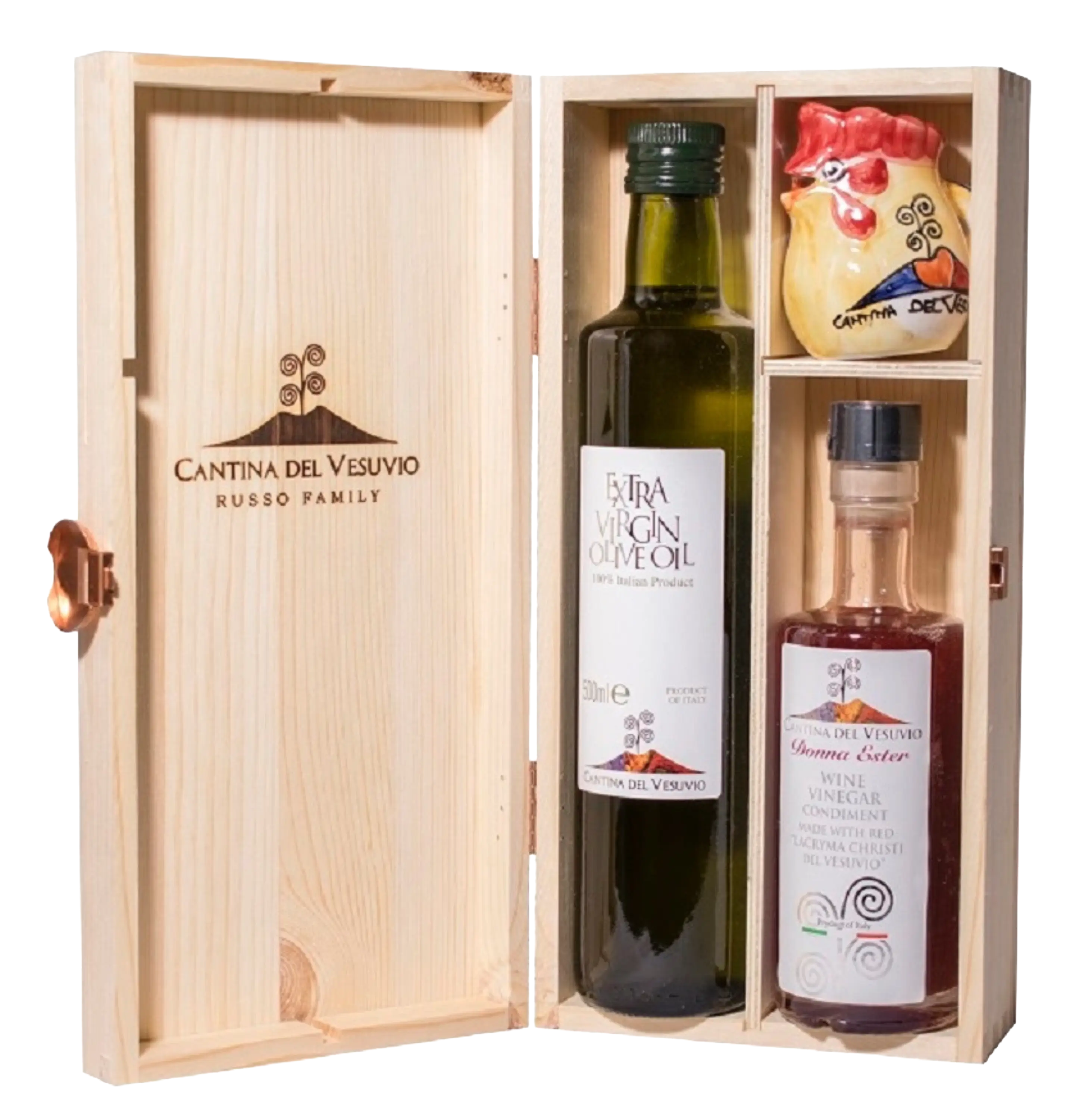 Coffret cadeau comprenant de l'huile d'olive extra vierge du Vésuve, du vinaigre de vin Lacryma Christi del Vesuvio DOC "Donna Ester" et un petit coq peint à la main dans une boîte en bois.